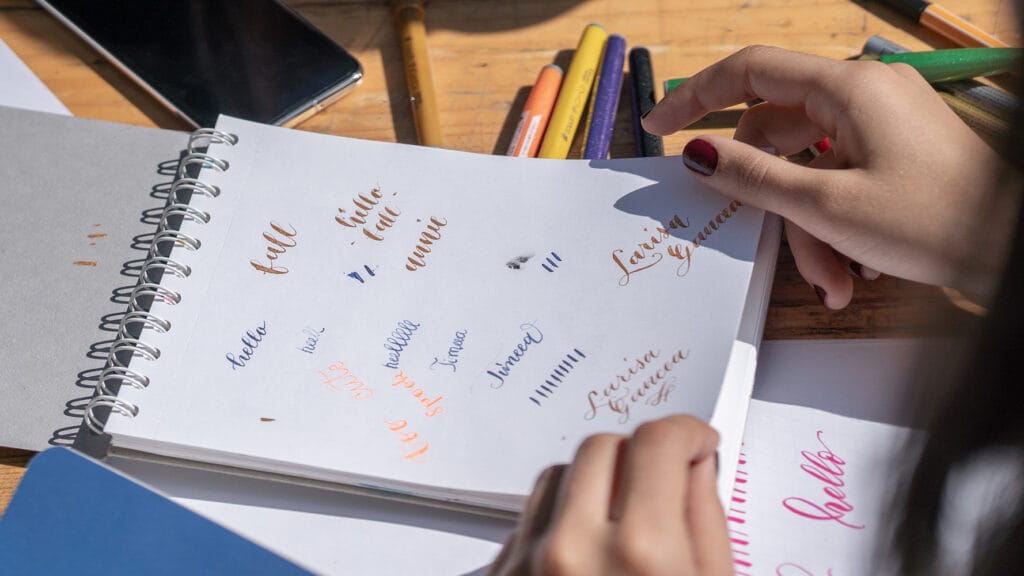Unii au stat câteva minute dornici să vorbim despre caligrafie și arta caligrafică, alții mai mult, curajoși să scrie caligrafic. Au încercat caligrafia modernă cu brush pen-ul, au pus întrebări, au schimbat impresii, au aflat lucruri despre istoria scrisului de mână și despre litere ca formă de expresie.